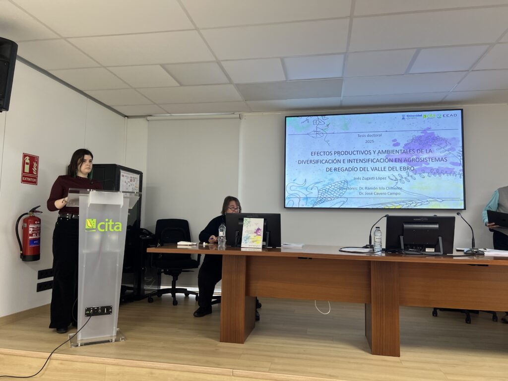 El pasado 27 de enero, Inés Zugasti López obtuvo su título de doctora por la Universidad de Zaragoza tras la defensa de su trabajo de Tesis Doctoral titulado “Efectos productivos y ambientales de la diversificación e intensificación en agrosistemas de regadío del valle del Ebro”. La tesis doctoral dirigida por los doctores Ramón Isla Climente y José Cavero Campo, obtuvo la calificación de Sobresaliente Cum Laude.