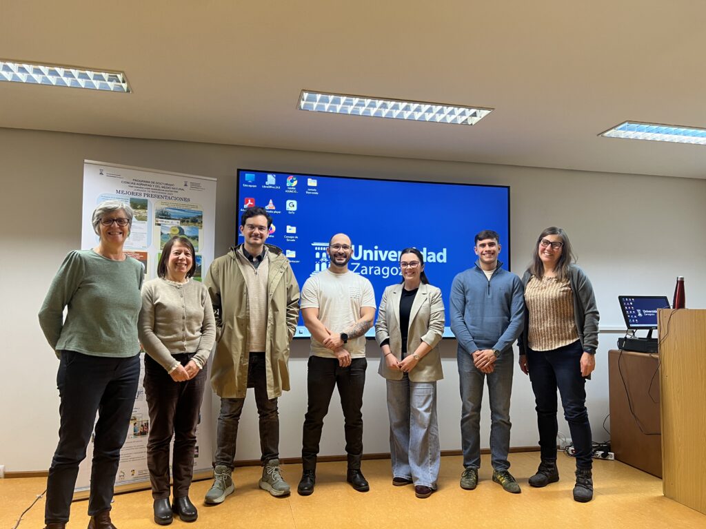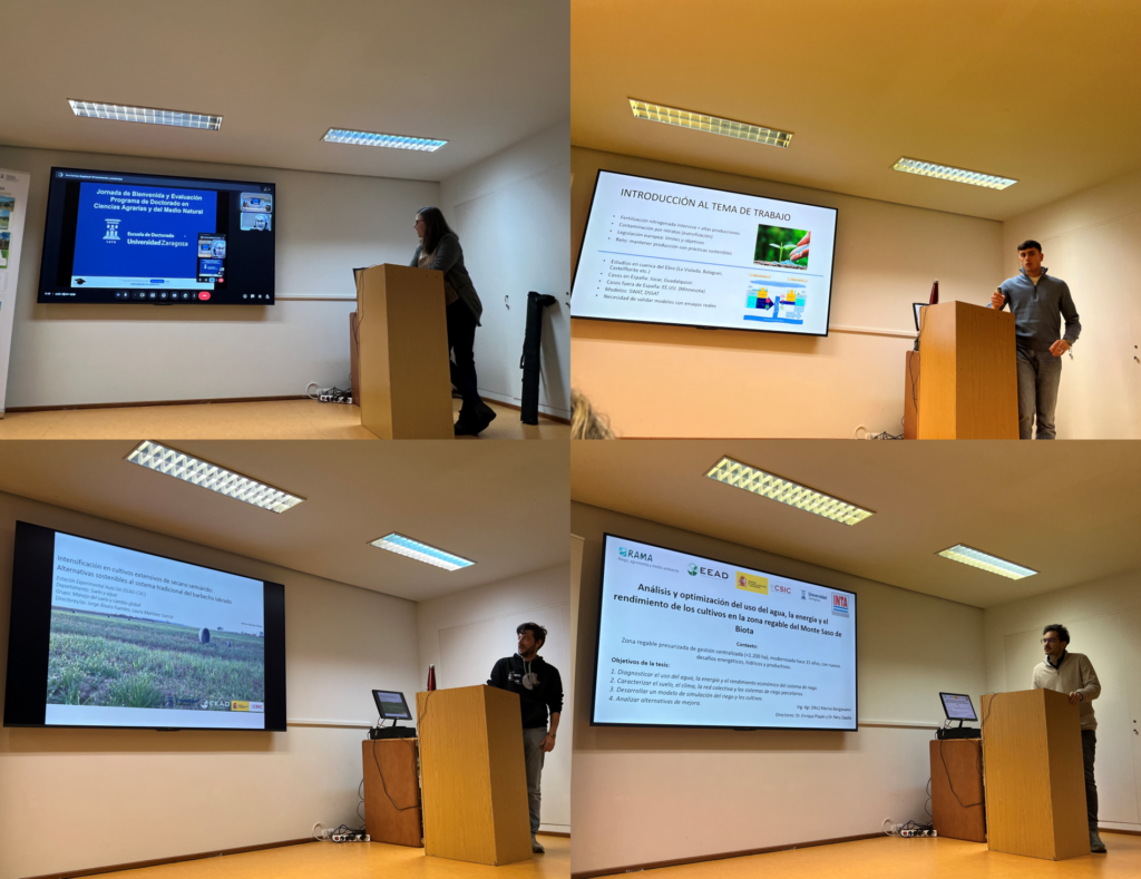 Manuel Sampériz Sarvisé (Gestión de la fertilización en base a la variabilidad espacial del suelo). A continuación, Adrián Aladrén Pérez (Intensificación de cultivos extensivos de secano semiárido: Alternativas sostenibles al sistema tradicional de barbecho labrado) y Marcos Bongiovanni Ferreyra (Análisis y optimización del uso del agua, la energía y el rendimiento de los cultivos en la zona regable del Monte Saso de Biota). Finalmente, Mirela Mujkic (Uso sostenible de los recursos hídricos y del suelo para reducir el impacto ambiental de las actividades agrícolas y la mitigación del cambio climático en los sistemas agrícolas de regadío) y Alexey Valero Jorge (Modelación y teledetección para la actualización de la demanda hídrica de cultivos en grandes zonas regables ante el reto de mejorar la gestión de agua en un contexto de cambio climático).